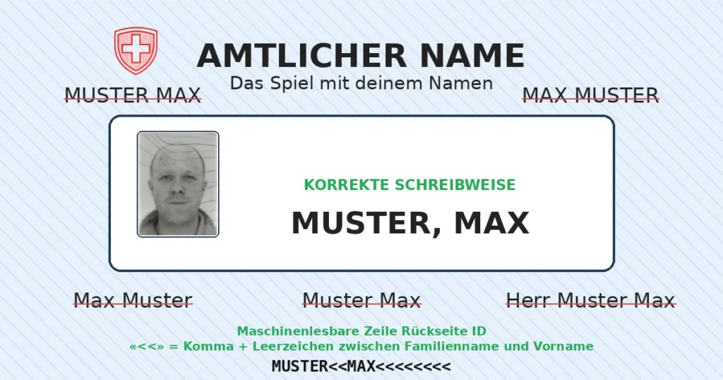 In der Schweiz sind Familienname und Vorname(n) keine frei wählbare Schreibweise, sondern amtlich festgelegte Personendaten, die in Registern geführt und in Ausweisen ausgewiesen werden. Diese amtliche Schreibweise ist die Grundlage dafür, dass Schreiben, Zustellungen und Entscheidungen eindeutig einer Person zugeordnet werden können – ohne Verwechslungen, ohne Interpretationen und ohne willkürliche Varianten.